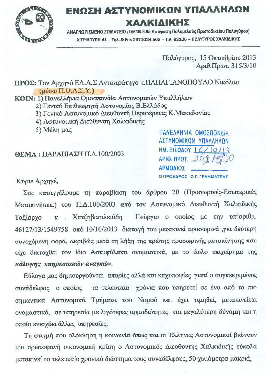 Η Ένωση Αστυνομικών Υπαλλήλων Χαλκιδικής με το επισυναπτόμενο υπ’ αριθ. 315/3/10 από 15/10/2013 έγγραφό της καταγγέλλει την δεύτερη συνεχόμενη προσωρινή μετακίνηση συναδέλφου μέλους της αμέσως μετά τη λήξη της πρώτης προσωρινής μετακίνησής του που διήρκησε ένα μήνα γιατί ως αναφέρεται, αυτή διατάχθηκε κατά παρέκκλιση των διατάξεων του άρθρου 20 του Π.Δ. 100/03 όπου προβλέπεται η προσωρινή μετακίνηση, όχι όμως πέραν του μηνός.