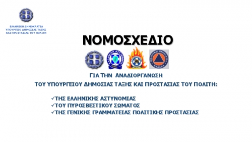 Παρουσίαση του Σχεδίου Νόμου «Αναδιοργάνωση της Ελληνικής Αστυνομίας, του Πυροσβεστικού Σώματος και της Γενικής Γραμματείας Πολιτικής Προστασίας, αναβάθμιση Υπηρεσιών του Υπουργείου Δημόσιας Τάξης και Προστασίας του Πολίτη και ρύθμιση λοιπών θεμάτων αρμοδιότητας Υπουργείου Δημόσιας Τάξης και Προστασίας του Πολίτη»