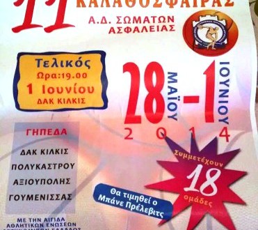 Το Παράρτημα Βορείου Ελλάδος της Αθλητικής Ένωσης Αστυνομικών ανακοινώνει ότι την Πέμπτη (29/05) στο Κιλκίς ξεκινά το 11ο Πρωτάθλημα Αστυνομικών Διευθύνσεων και Σωμάτων Ασφαλείας, στο οποίο παίρνουν μέρος 18 ομάδες από διαφόρους νομούς της χώρας, οι οποίες χωρίστηκαν σε τέσσερις ομίλους. Το πρόγραμμα έχει ως εξής: