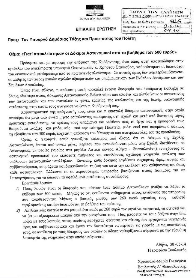 Με ιδιαίτερη χαρά πληροφορηθήκαμε πως το θέμα του αποκλεισμού των Δοκίμων Αστυφυλάκων από το βοήθημα των 500 ευρώ έφτασε και στη Βουλή των Ελλήνων με ερώτηση προς τον Υπουργό Δημόσιας Τάξης και Προστασίας του Πολίτη, την οποία μπορείτε να δείτε και να διαβάσετε εδώ