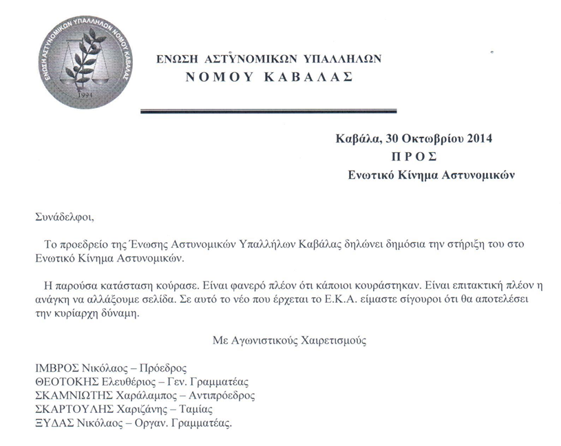 Με ανακοίνωση της η Ένωση Αστυνομικών Υπαλλήλων Καβάλας, προσχωρεί και αυτή με τη σειρά της στο Ενωτικό Κίνημα Αστυνομικών.
