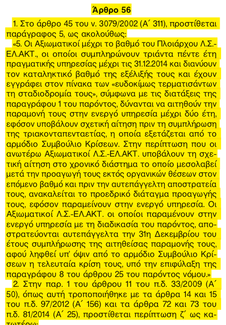 Σε άσχετο νομοσχέδιο -συνηθίζεται πλέον- πέρασε τροπολογία σύμφωνα με την οποία δίδεται σε στελέχη του Λιμενικού Σώματος -Ακτοφυλακής να παραμένουν στην ενεργό υπηρεσία ακόμη και μετά από την συμπλήρωσης 35ετίας.