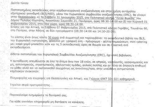 Το Σάββατο 31-1-2015 και την Κυριακή 1-2-2015 θα διενεργηθούν πιστοποιημένες εκπαιδεύσεις στην καρδιοπνευμονική αναζωογόνηση και στη χρήση αυτόματου εξωτερικού απινιδωτή μέσω του Ευρωπαϊκού συμβουλίου αναζωογόνησης στη Θεσσαλονίκη.