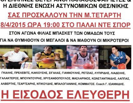 Αστυνομικοί από υπηρεσίες της Ασφάλειας, της Τροχαίας, της Διεύθυνσης Αστυνομικών Επιχειρήσεων, από το τμήμα του Αεροδρομίου, αλλά και από την ομάδα ΔΙ.ΑΣ. θα αναμετρηθούν με τους Πρέλεβιτς, Κακιούση, Σιογάλα, Λιαδέλη, Γαλακτερό, Μπουντούρη, αλλά και με άλλους παίκτες που απογείωσαν τα προηγούμενα χρόνια το ελληνικό μπάσκετ, ενώ παρών στην εκδήλωση θα είναι και ο Νίκος Γκάλης. Το φιλικό παιχνίδι μπάσκετ ανάμεσα στη Διεθνή Ενωση Αστυνομικών Θεσσαλονίκης και τους Ελληνες βετεράνους καλαθοσφαιριστές έχει προγραμματιστεί για τις επτά το απόγευμα της Μ. Τετάρτης, 8 Απριλίου. Μάλιστα, όπως λένε οι διοργανωτές, η είσοδος θα είναι ελεύθερη, ωστόσο για όποιον θέλει να βοηθήσει θα υπάρχει ένα διαφορετικό εισιτήριο. Σκοπός είναι να συγκεντρωθούν τρόφιμα -όχι είδη ψυγείου- και είδη καθαριότητας και υγιεινής για τα παιδιά του Παιδικού χωριού ΣΟΣ στο Πλαγιάρι. Οι θεατές μπορούν να φέρουν μαζί τους στο Παλέ και να προσφέρουν μακαρόνια, ρύζι, γάλα εβαπορέ, όσπρια, αλλά και είδη καθαριότητας όπως απορρυπαντικά ή χαρτικά ακόμη και οδοντόκρεμες.