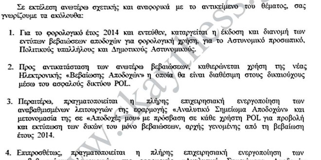 Σύμφωνα με την υπ’ αριθμ. 1761/15/752372 από 30-04-2015 διαταγή του Αρχηγείου καταργείται η έκδοση και διανομή βεβαιώσεων αποδοχών, η οποία πλέον θα πραγματοποιείται μέσω του POL!