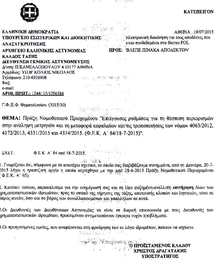 Σε συνέχεια του ανωτέρω σχετικού εγγράφου μας, σας αποστέλλουμε συνημμένα την υπ’ αριθ. 1244/15/1295686 από 19/07/2015 Δ/γή του Α.Ε.Α./Κλάδος Τάξης/Διεύθυνση Γενικής Αστυνόμευσης με την οποία η φρούρηση των χρηματοπιστωτικών ιδρυμάτων (τραπεζών) παύει να ισχύει και παρακαλούμε για την ενημέρωσή σας.