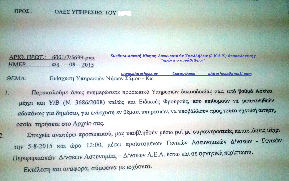 Περιήλθε σήμερα σε όλες τις υπηρεσίες η παρακάτω διαταγή με προθεσμία δήλωσης την 05-08-2015.
