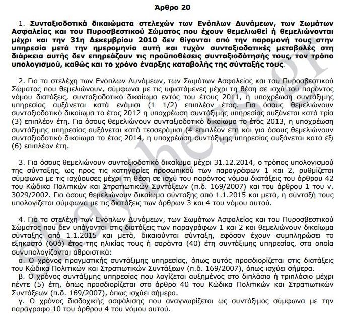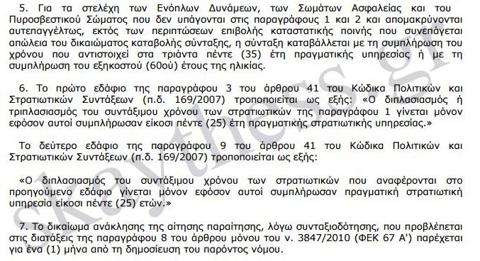 Ορίζεται ότι τα στελέχη των Ενόπλων Δυνάμεων, των Σωμάτων Ασφαλείας και του Πυροσβεστικού Σώματος που αποχωρούν από την υπηρεσία από την επομένη της ημερομηνίας δημοσίευσης του υπό ψήφιση νόμου και μετά, δικαιούνται σύνταξη εφόσον έχουν συμπληρώσει το 58ο έτος της ηλικίας τους και 40 έτη συντάξιμης υπηρεσίας, στα οποία συνυπολογίζονται οι προβλεπόμενοι στην παράγραφο 4 του άρθρου 20 του νόμου 3865/2010 χρόνοι.