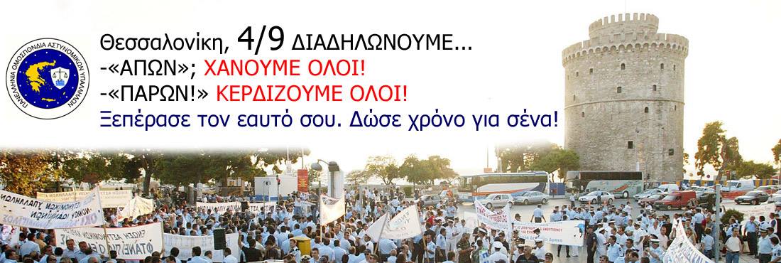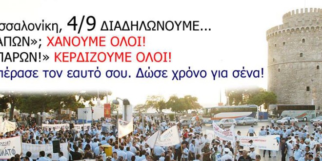 ΚΑΛΟΥΜΕ όλους τους Συναδέλφους και τις Συναδέλφισσές μας, να σταθούν στο ύψος των περιστάσεων και συνεπείς στο ιστορικό μας ραντεβού, να στείλουμε ΟΛΟΙ ΜΑΖΙ ηχηρά μηνύματα από τη Θεσσαλονίκη, στις 4/9/2015 και όποτε και όπου αλλού χρειαστεί.