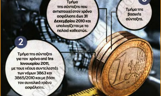 • Τμήμα της σύνταξης που αντιστοιχεί στον χρόνο ασφάλισης από 1ης Ιανουαρίου 2011 έως την ημερομηνία συνταξιοδότησης, το οποίο υπολογίζεται με τους νέους συντελεστές των νόμων 3863 και 3865/2010 και με βάση τον συνολικό χρόνο ασφάλισης. Επίσης οι ασφαλισμένοι δικαιούνται τμήμα της βασικής σύνταξης, η οποία έχει οριστεί στα 360 €. Για κάθε έτος μετά την 1η/1/2011 ο ασφαλισμένος δικαιούται 1/35ο της βασικής σύνταξης που καταβάλλεται από την ημερομηνία συνταξιοδότησης.
