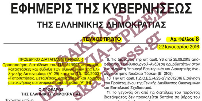 Σας γνωρίζουμε ότι, απογευματινές ώρες της χθες, δημοσιεύθηκε στην Εφημερίδα της Κυβερνήσεως (Αρ. Φύλλου 8 – Τεύχος Α΄) το προεδρικό διάταγμα υπ’ αριθμ. 4, που αφορά τροποποιήσεις στην Ιεραρχία, καταστάσεις και εξέλιξη των αξιωματικών της Ελληνικής Αστυνομίας (π.δ. 24/1997) και Τοποθετήσεις, μεταθέσεις αποσπάσεις και λοιπές μετακινήσεις αστυνομικού προσωπικού (π.δ. 100/2003).