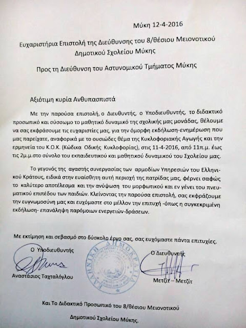 “…θέλουμε να σας εκφράσουμε τις ευχαριστίες μας, η δ/νση, το διδακτικό προσωπικό και σύσσωμο το μαθητικό δυναμικό του σχολείου, για την όμορφη εκδήλωση-ενημέρωση που μας παρείχατε, αναφορικά με το ουσιώδες θέμα της Κυκλοφοριακής Αγωγής και την ερμηνεία του Κ.Ο.Κ. (Κώδικα Οδικής Κυκλοφορίας), στις 11-4-16 …. στο σύνολο του εκπαιδευτικού και μαθητικού δυναμικού του Σχολείου μας.